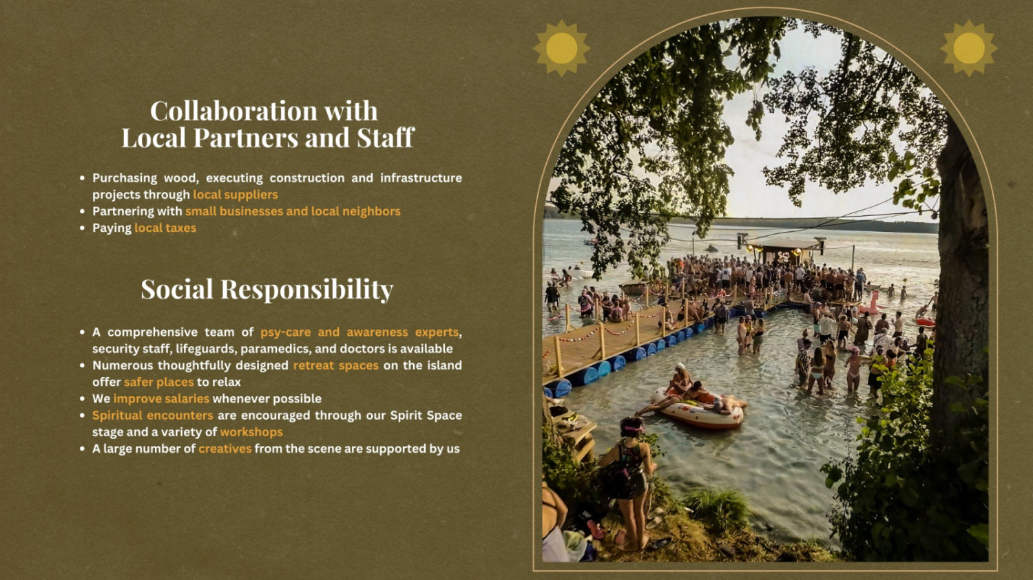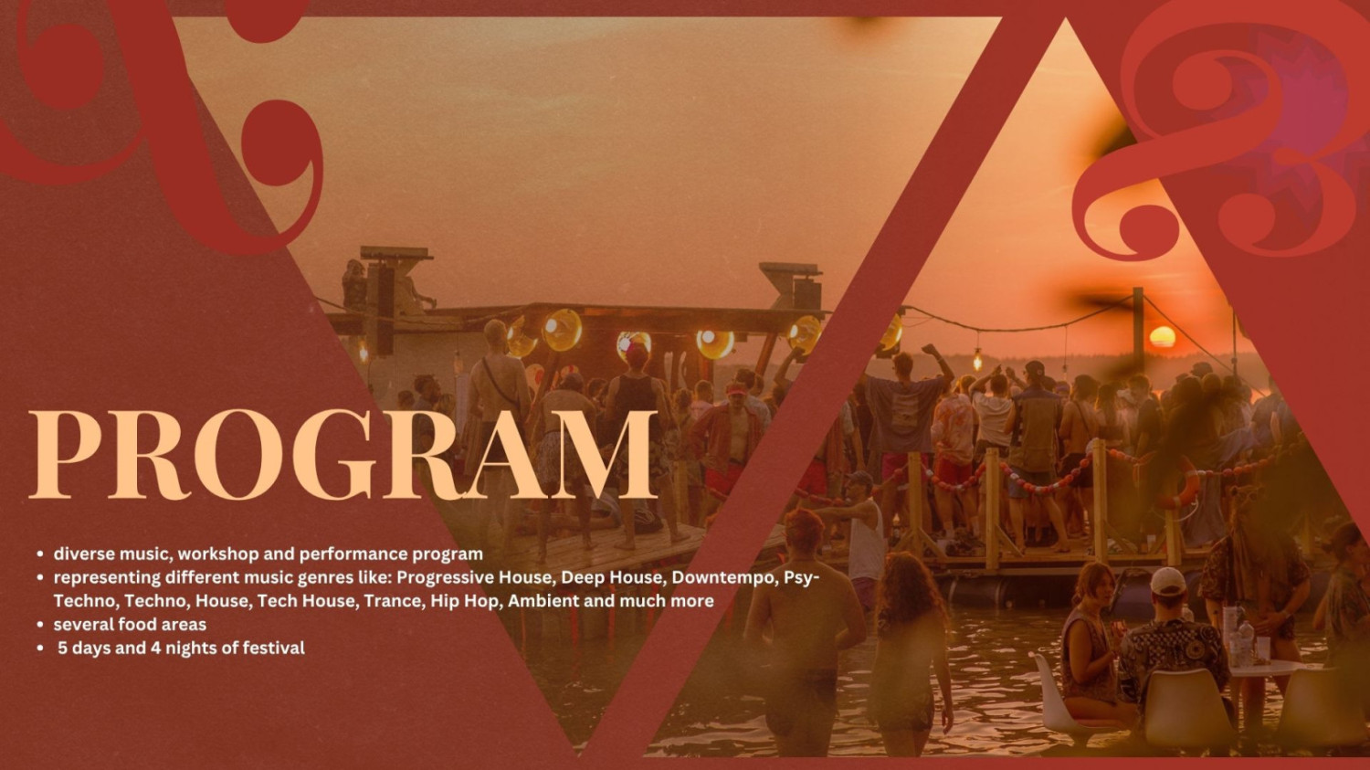You can explore 7 stages with different electronic music genres, a wellness / workshop area with sauna & campfire, a cozy awareness & psy care area, a variety of foods, various performances, installations, light shows and much more. To ensure a diverse and high-quality experience for 2024 we teamed up with different crews we love and are proud to present to you: